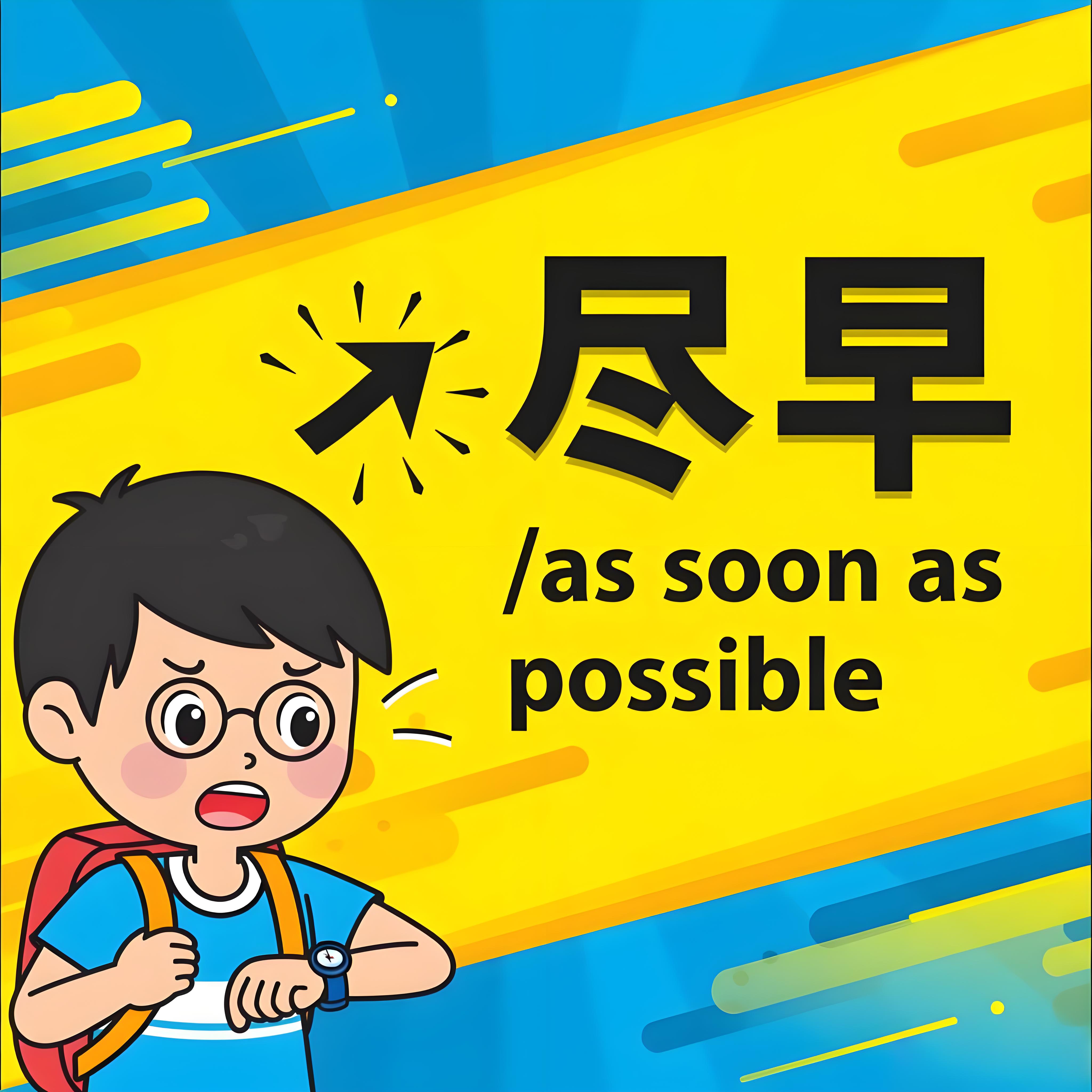 拼音 : jǐn zǎo 年级 : K5 课程 : L10 英文 : as soon as possible / at the earliest 关联汉字 : 尽 早 句子 医生建议他尽早治疗,这样恢复得会更快。 如果你打算出国留学,最好尽早准备申请材料。 我们应该尽早出发,以避免交通高峰期的堵车。 中文发音练习/Chinese Pronunciation Practice 请朗读以下句子/Please read the following sentence: 你好 开始录音/Start recording 停止录音 / Stop recording 识别结果/Identification results: